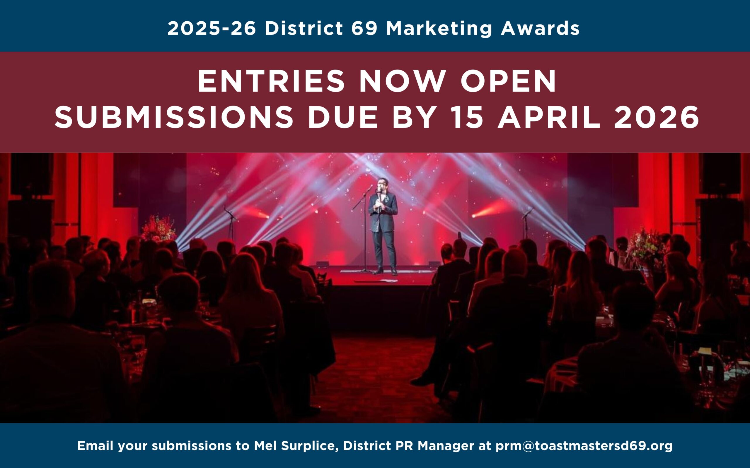 Submit your entry via email to Mel Surplice at prm@toastmastersd69.org by 15 April 2026.