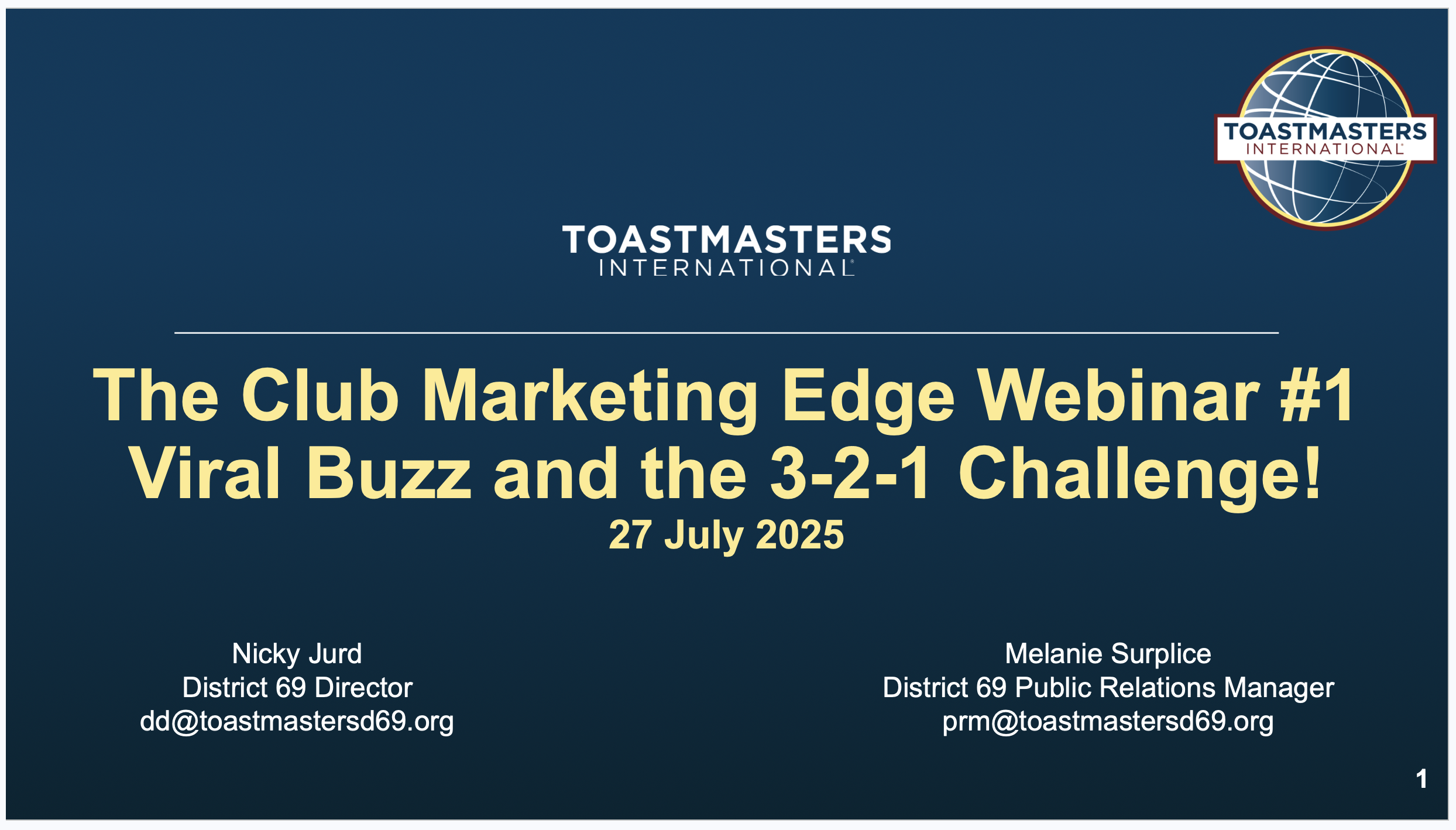 This was the core message of the first session in District 69’s new Club Marketing Edge webinar series, hosted by PR Manager Mel Surplice and District Director Nicky Jurd. This webinar saw the launch of the 3-2-1 Challenge – a simple, flexible campaign that any Toastmasters club can use to turn conversations into guests, and guests into members.