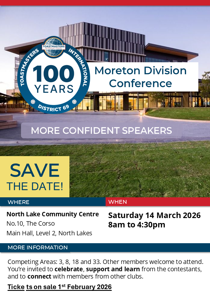 Come and enjoy the best of Area 3, 8, 18 and 33 compete in a speech extravaganza set to be an impressive and entertaining celebration of talent. March 14, 2026 at North Lakes Community Centre.