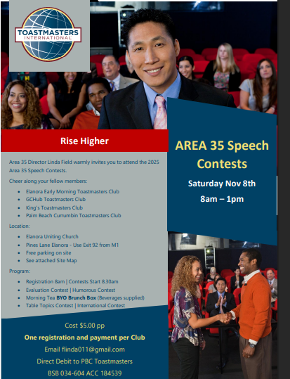 The area's finest speakers will compete in 4 contests - Table Topics, Evaluation, Humorous, and International. The winner of each contest qualifies to represent their area and club at the Western Division 2026 Conference at Dalby. A celebration of the Area 4 clubs and their best speakers, together with a chance to meet new people and renew old friendships.